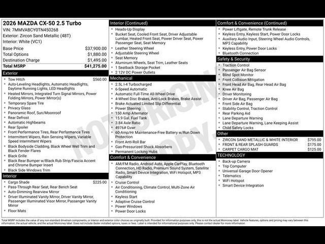 Leather Seats, Sunroof, Panoramic Roof, All Wheel Drive, Power Liftgate Mazda CX-50 2.5 Turbo with Zircon Sand Metallic exterior and White interior features a 4 Cylinder Engine with 227 HP at 5000 RPM*.