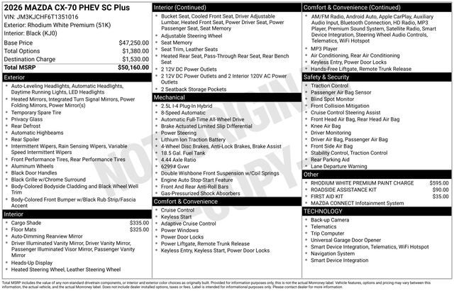 Leather Seats, Navigation, All Wheel Drive, Power Liftgate, Rear Air. Mazda CX-70 PHEV SC Plus with Rhodium White Premium exterior and Black interior features a 4 Cylinder Engine with 323 HP at 6000 RPM*.
