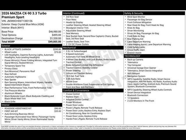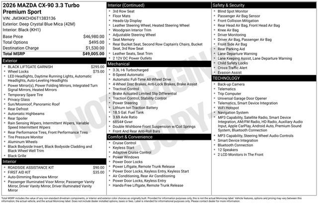 Leather Seats, Third Row Seat, Navigation, Sunroof, Panoramic Roof. Mazda CX-90 Premium Sport with Deep Crystal Blue Mica exterior and Black interior features a Straight 6 Cylinder Engine with 280 HP at 5000 RPM*.