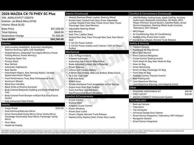 Leather Seats, Navigation, All Wheel Drive, Power Liftgate, Rear Air. Mazda CX-70 PHEV SC Plus with Jet Black Mica exterior and Black interior features a 4 Cylinder Engine with 323 HP at 6000 RPM*.