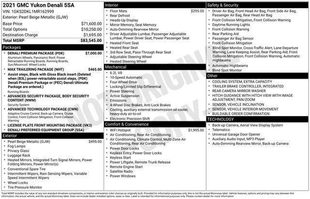 DENALI PREMIUM PACKAGE includes (CWN) Advanced Technology Package content, (C3U) Panoramic power sunroof, (B3L) power-retractable assist steps with perimeter lighting, (RPU) 22 bright machined aluminum wheels with premium paint and (SFE) wheel locks, LPO, REAR SEAT MEDIA SYSTEM includes dual rear seat-mounted 12.6 diagonal color-touch LCD HD screens, Wi-Fi wireless projection capability, two 2-channel wireless infrared digital headphones with 2 HDMI ports on the back of the center console; compatible with Bluetooth® headphones, ADVANCED TECHNOLOGY PACKAGE includes (KSG) Adaptive Cruise Control, (UGN) Enhanced Automatic Emergency Braking, (DRZ) Rear Camera Mirror, (CWA) Rear Camera Mirror Washer and (NWM) Advanced Security Package content, LPO, ALL-WEATHER FLOOR LINERS, 1ST, 2ND AND 3RD ROWS (dealer-installed), AUDIO SYSTEM, 10.2 DIAGONAL GMC INFOTAINMENT SYSTEM WITH NAVIGATION includes multi-touch display, AM/FM/SiriusXM stereo, Bluetooth® streaming audio for music and most phones, Android Auto® and Apple CarPlay® capability for compatible phones, advanced voice recognition, in-vehicle apps, personalized profiles for infotainment and vehicle settings (STD), ENGINE, 6.2L ECOTEC3 V8 with Dynamic Fuel Management, Direct Injection and Variable Valve Timing, includes aluminum block construction (420 hp [313 kW] @ 5600 rpm, 460 lb-ft of torque [624 Nm] @ 4100 rpm) (STD), TRANSMISSION, 10-SPEED AUTOMATIC electronically controlled with overdrive, includes Traction Select System including tow/haul (Most vehicles built on or after 6-7-2021 with a V8 engine will have (NSS) Not Equipped with Automatic Stop/Start, which removes Automatic Stop/Start, Engine control stop/start disable button and its content.) (STD), ADVANCED SECURITY PACKAGE, BODY SECURITY CONTENT includes (UTR) self-powered horn, (UTV) interior movement sensors, (UTU) vehicle inclination sensors, (UTW) glass break sensors in rear quarter glass and liftgate window and door and liftgate lock shields.