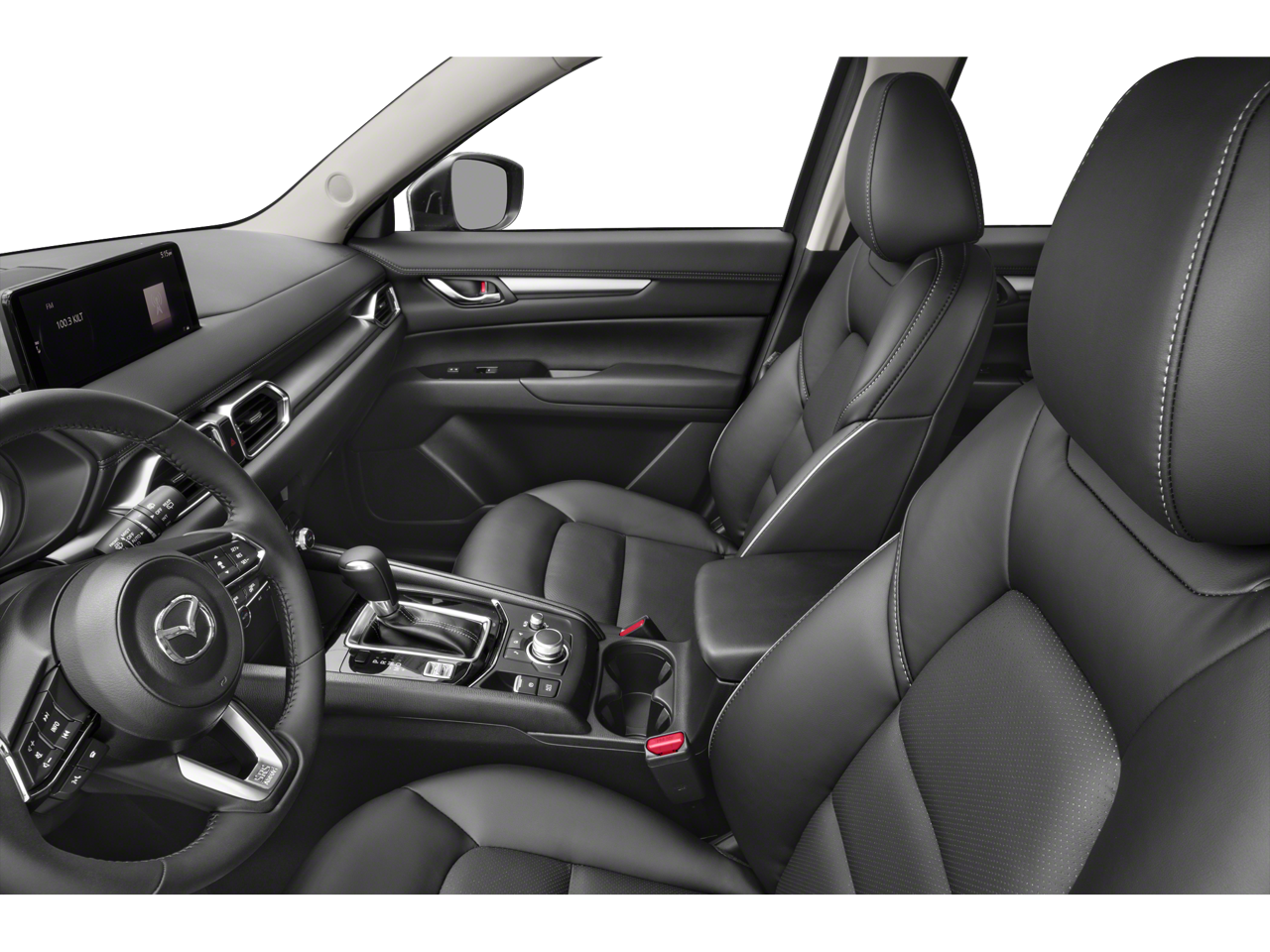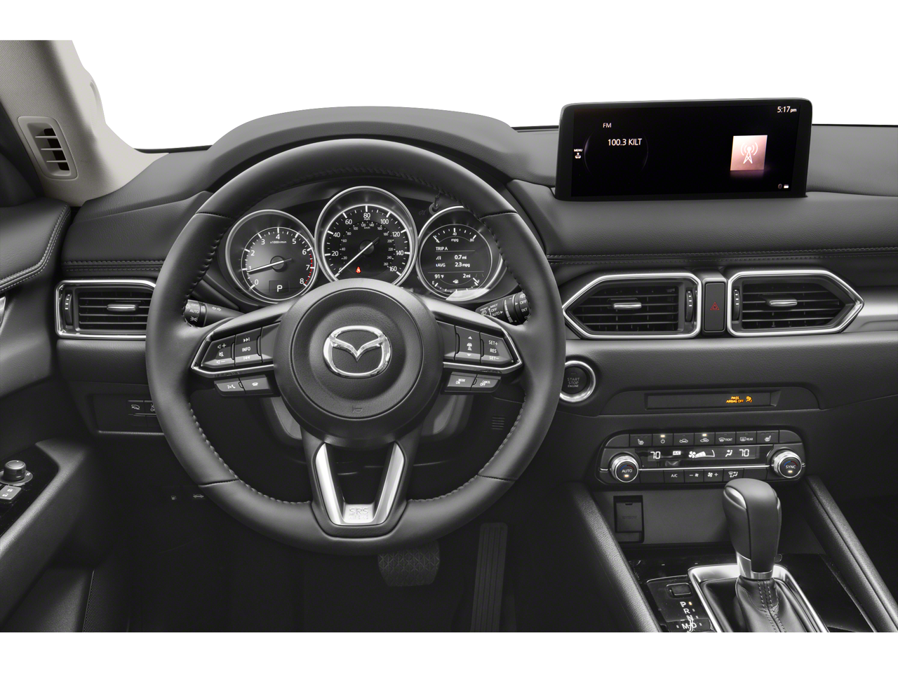 Inside, the CX-5 is loaded with a wealth of premium features, including an advanced infotainment system with voice command, Apple CarPlay and Android Auto integration, and a premium audio system. The dual-zone automatic climate control, heated front seats, and leather-wrapped steering wheel and shift knob add to the vehicle's luxurious feel.