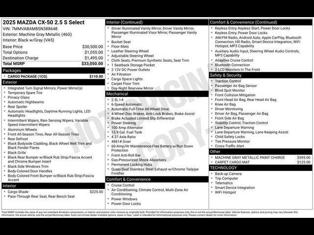 All Wheel Drive, Back-Up Camera, iPod/MP3 Input, Onboard Communications System, Aluminum Wheels. Mazda CX-50 2.5 S Select Package with Machine Gray Metallic exterior and Black w/Gray interior features a 4 Cylinder Engine with 187 HP at 6000 RPM*.