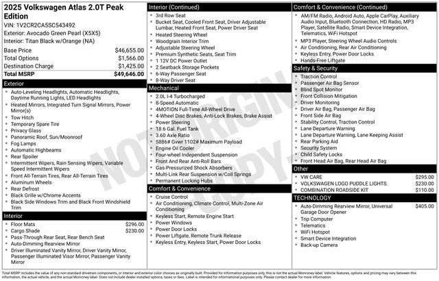 Third Row Seat, Sunroof, Panoramic Roof, All Wheel Drive, Power Liftgate Volkswagen 2.0T Peak Edition with Avocado Green Pearl exterior and Titan Black w/ Orange Stitching interior features a 4 Cylinder Engine with 269 HP at 5500 Rpm*.
