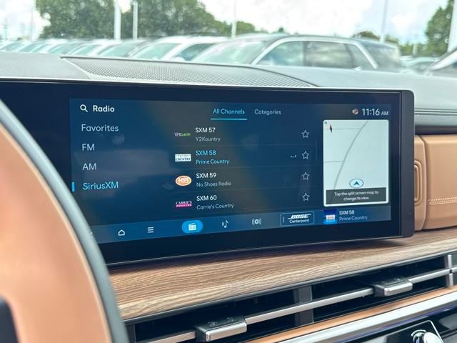 - Radio: AM/FM/HD Bose Premium Audio System -inc: 12 speakers including subwoofer, external amplifier, 12.3" wide touchscreen, Apple CarPlay and Android Auto, Bluetooth® hands-free w/wireless audio streaming, dynamic voice recognition, USB connectivity, SiriusXM, Blue Link+ connected car system, navigation system including traffic flow w/incident data via HD Radio (HERE) and rear seat quiet mode